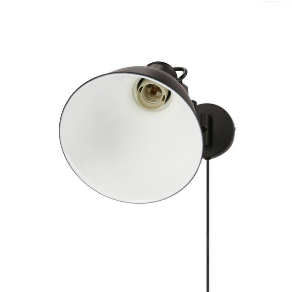 Efektowny kinkiet z metalowym kloszem (czarnym na zewnątrz, białym wewnątrz) na ruchomym ramieniu.