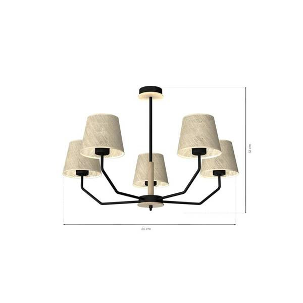 ETNA MLP7277 to stylowa lampa sufitowa z pięcioma źródłami światła. Korpus lampy wykonano z wysokiej jakości metalu w kolorze czarnym z drewnianymi wstawkami. Klosze są z delikatnie przepuszczającego światło lnu w kolorze kości słoniowej. Żyrandol będzie idealnym wyborem do wnętrz urządzonych w nowoczesnym stylu. Doskonale będzie się prezentować w: salonie, jadalni, sypialni, pokoju młodzieżowym, gabinecie, lokalu, biurze, przedpokoju, kuchni. Wysokość lampy to: 52 cm, szerokość 65 cm, głębokość 65 cm. Źródłem światła jest żarówka typu E27 o mocy max 40W w ilości 5 szt.