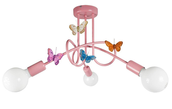 - Różowa lampa sufitowa do pokoju dziewczynki Tęczowy Zawijas to połączenie nowoczesnej formy i pastelowej kolorystyki. Wykonana z metalu, ozdobiona kolorowymi motylami na magnes. Trzy źródła światła E27 zapewniają równomierne, przyjemne oświetlenie pokoju