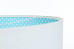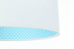 Abażur wykonany jest z tkaniny welurowej (mikrofibra) w kolorze białym na tworzywie sztucznym PCV. Wnętrze abażura wykonane jest również z tkaniny- niebieska z białymi groszkami. Abażur jest wyjątkowo wytrzymały, odporny na blaknięcie i posiada wszystkie niezbędne atesty by móc go użytkować w najbardziej wymagających wnętrzach jakimi są pokoje dziecięce. Lampa idealnie rozświetli dziecięcy pokoik.