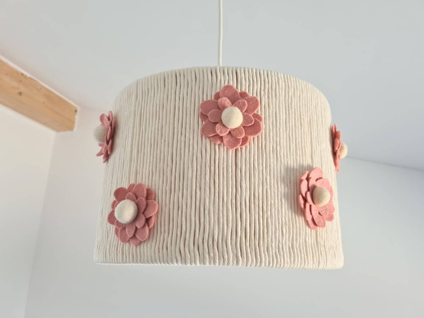 Ręcznie wykonana lampa wisząca do pokoju dziewczynki Różowe Kwiatki to oryginalna propozycja oświetlenia głównego pokoiku. Klosz lampy tkany i szyty jest ręcznie - z wykorzystaniem sznurka bawełnianego i włóczki. Dodatkowo kwiaty - typu margaretki wykonane są z wysokiej jakości filcu oraz polskiej wełny czesankowej. Doskonale wkomponuję się w każde wnętrze pokoju dziecięcego, nada mu indywidualny - bajkowy charakter. Idealnie sprawdzi się w pokoikach urządzonych w stylu Boho- naturalne materiały, ręczne wykonanie i pasja to największe atuty naszej lampy. Na próżno szukać takiej w markecie, na popularnych aukcjach - to wyjątkowa lampa dziecięca z duszą!