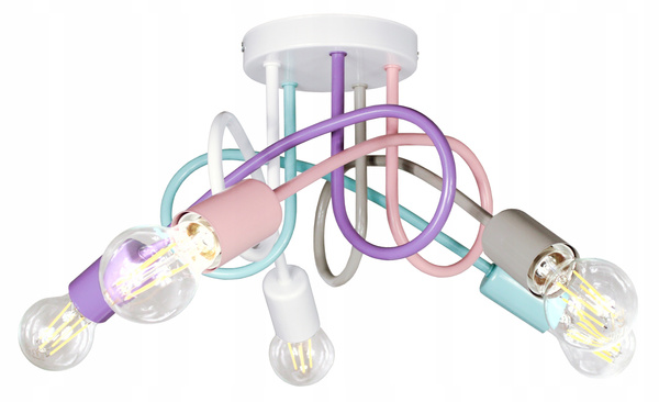 - Lampa sufitowa do pokoju dziecka Tęczowy Zawijas w pastelowych kolorach. Nowoczesny design, 5 źródeł światła E27, solidna metalowa konstrukcja. Idealna do pokoju dziewczynki lub chłopca.