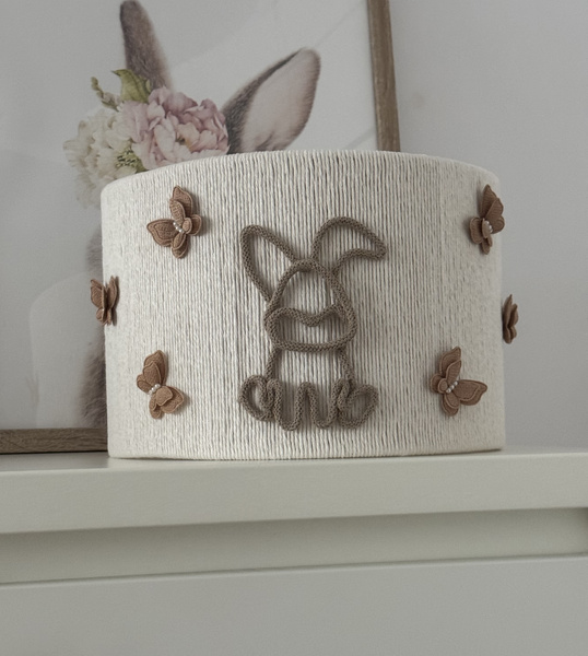- Ręcznie wykonana lampa wisząca do pokoju dziewczynki z króliczkiem i przepięknymi motylkami. Klosz z naturalnego sznurka bawełnianego ozdobiony delikatnymi ozdobami. Idealna do pokoju dziewczynki. Polska ręczna produkcja.