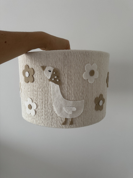 - Ręcznie wykonana lampa wisząca do pokoju dziecka z gąską i przepięknymi kwiatami. Klosz z naturalnego sznurka bawełnianego ozdobiony delikatnymi ozdobami. Idealna do pokoju dziewczynki. Polska ręczna produkcja.