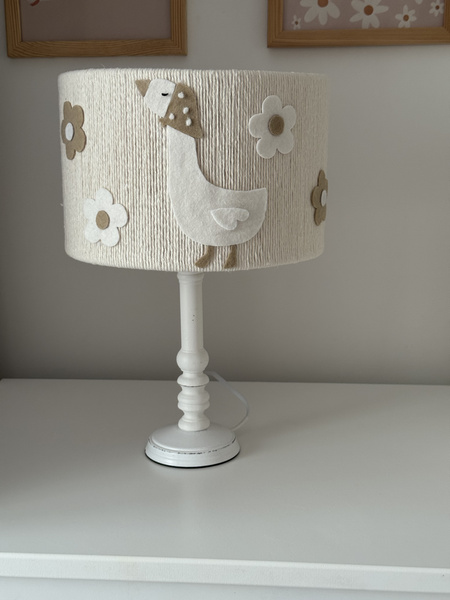 Motyw „Gąska w Kwiatach” stanowi centralny element dekoracyjny. Klosz ozdobiony jest jedną aplikacją z filcu przedstawiającą gąskę oraz sześcioma delikatnymi kwiatkami w odcieniach beżu i bieli. Ten subtelny motyw buduje ciepłą, bajkową atmosferę i sprawia, że lampka jest nie tylko źródłem światła, ale również piękną dekoracją dziecięcego wnętrza.