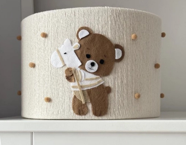 Centralnym elementem dekoracyjnym jest aplikacja misia trzymającego konika, wykonana z miękkiego filcu. Całość dopełniają subtelne, dekoracyjne kropeczki, które dodają lampie lekkości i bajkowego uroku, nie przytłaczając jednocześnie wnętrza.