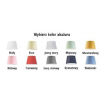Dostępne kolory abażuru - biały, ecru, jasny szary (gołębi), miętowy, musztardowy, jasny różowy, szary (stalowy), czerwony, niebieski, granatowy