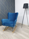 Stylowy Fotel Skandynawski OLIVIA w pięknym niebieskim kolorze bujany z przeszyciami na oparciu i poduszką